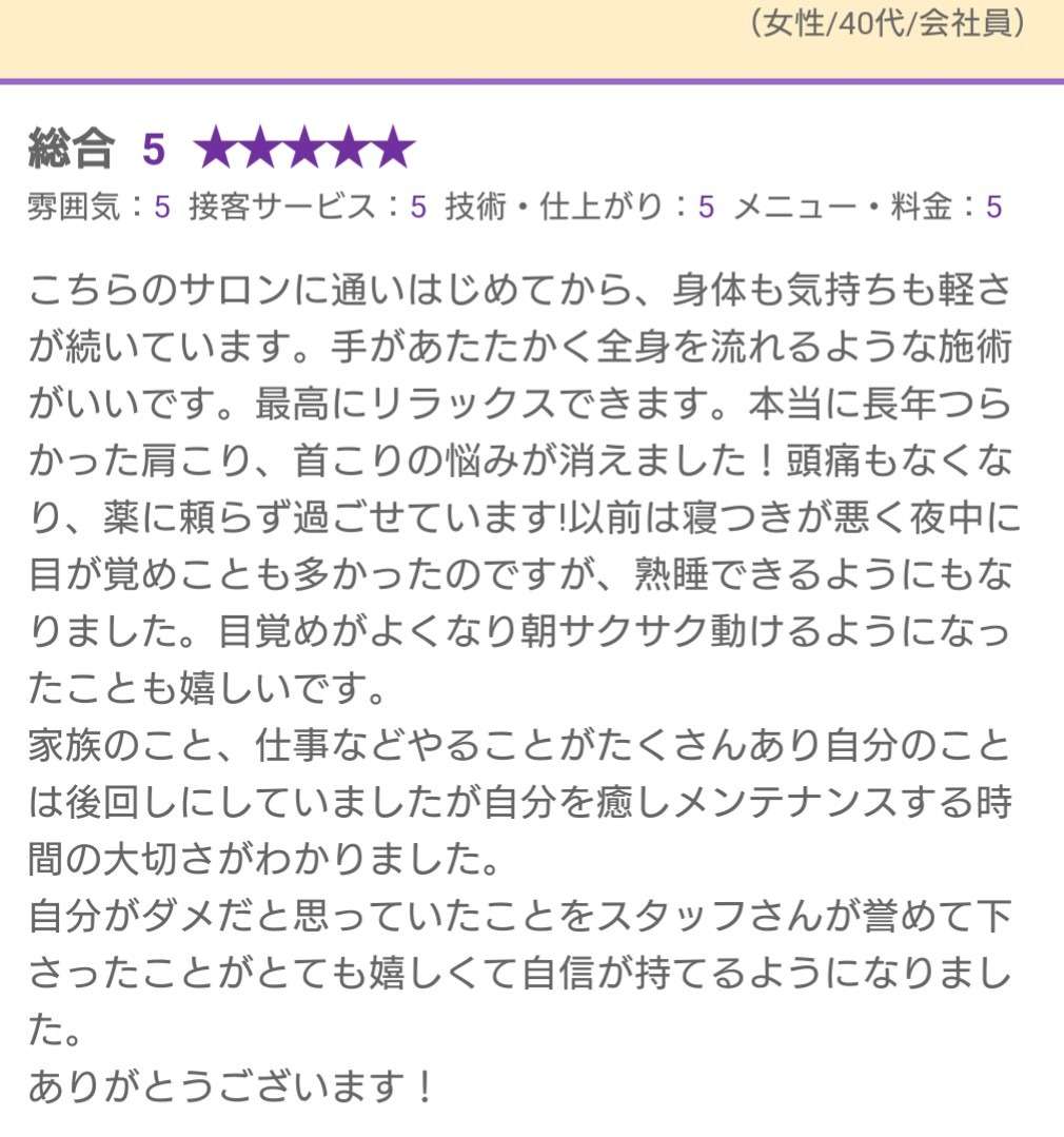 辛い肩こり・疲労が抜けるだけでなく、ムクミ、冷え、不眠、女性特有のお悩みも改善できたとリピーター様から